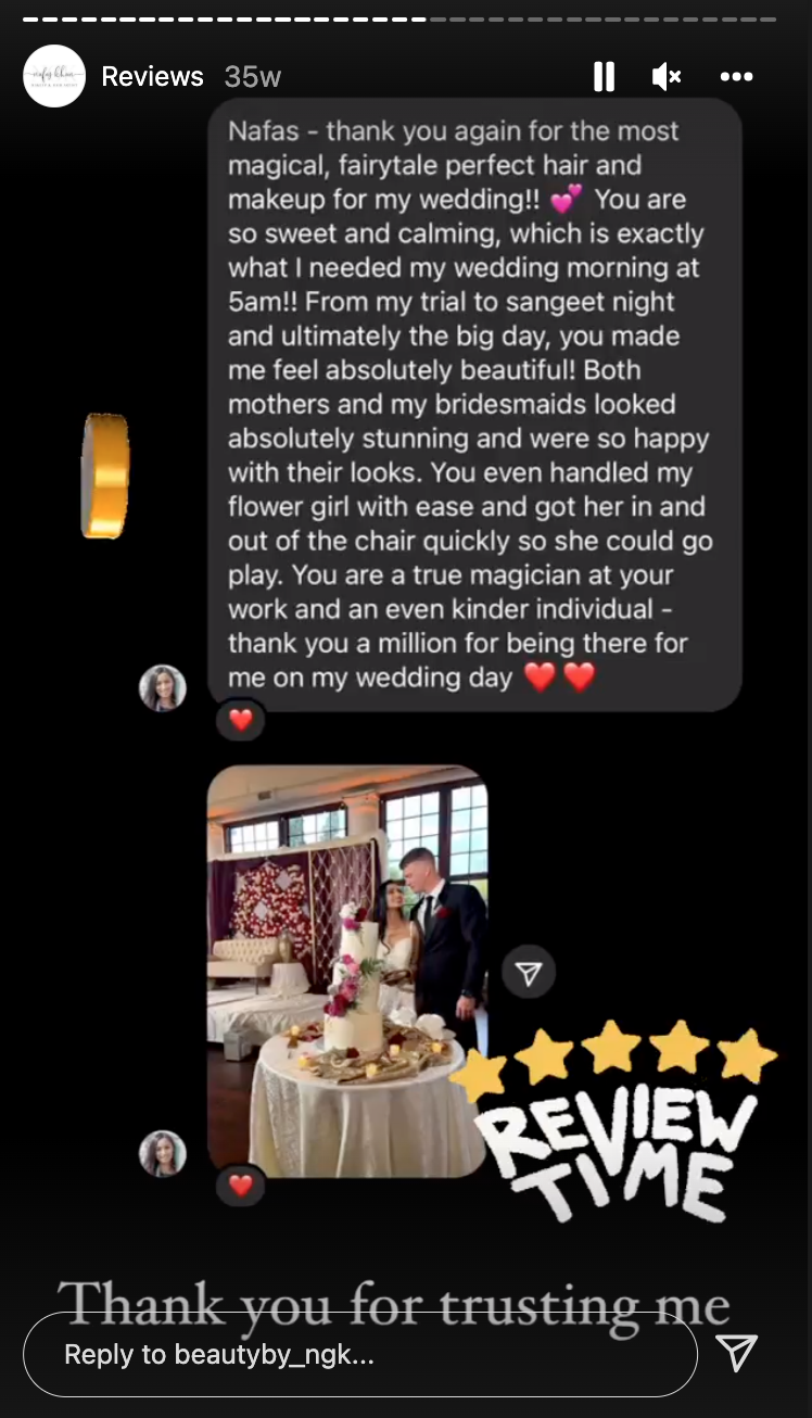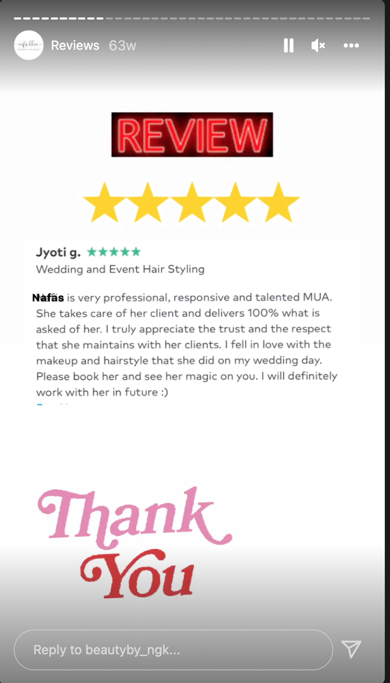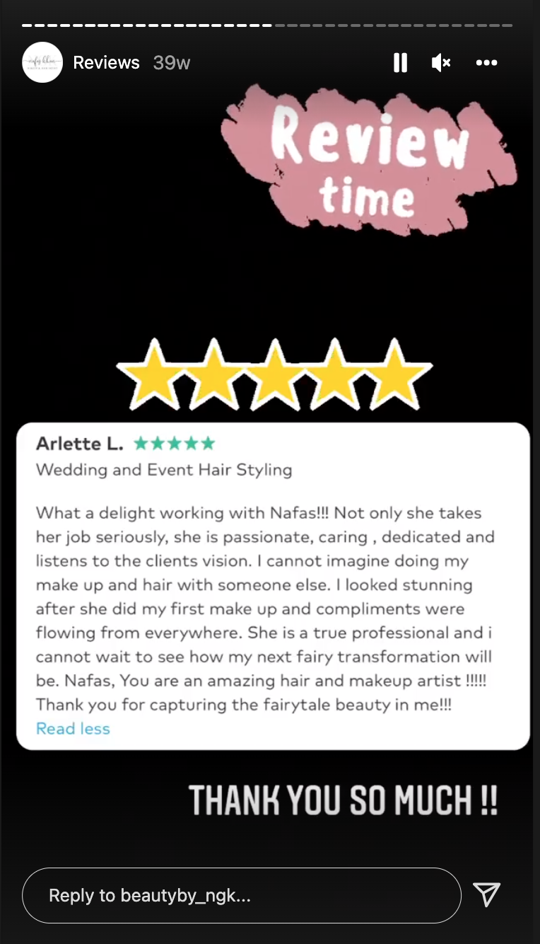 "Nafas did the makeup for me and did an absolutely amazing job. She is beyond fabulous!!!!!!"