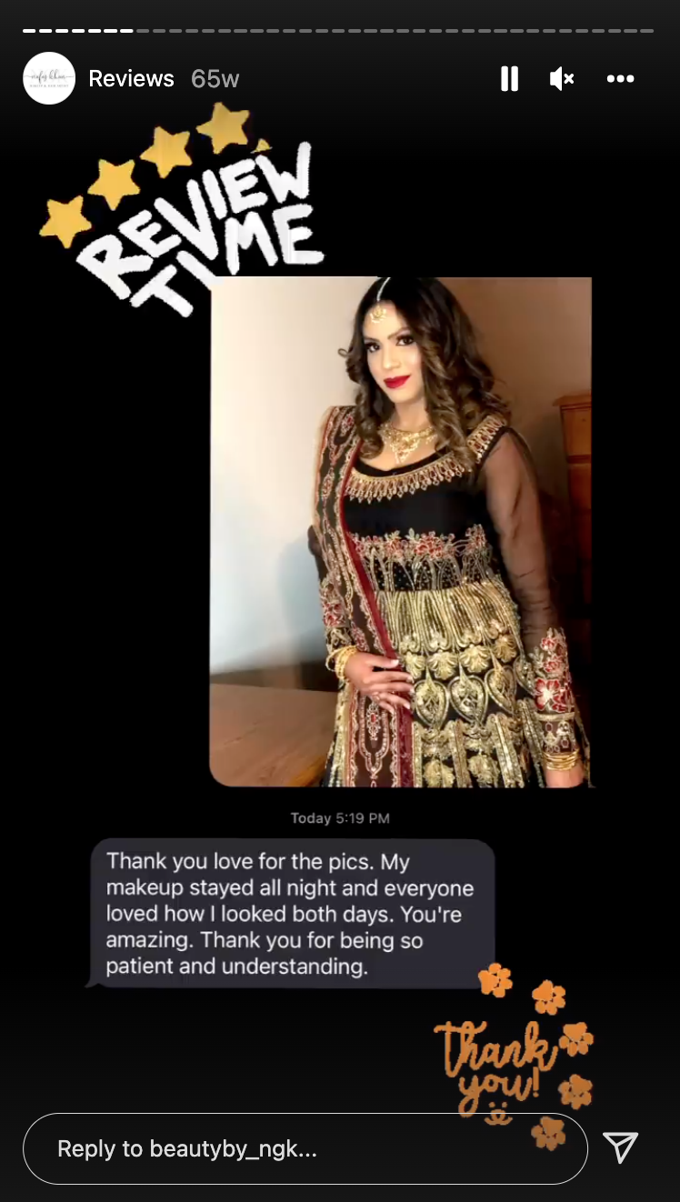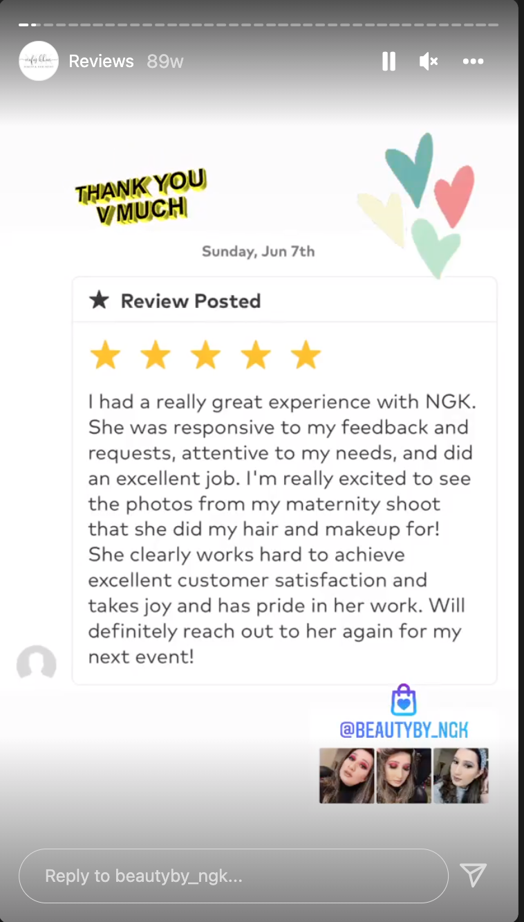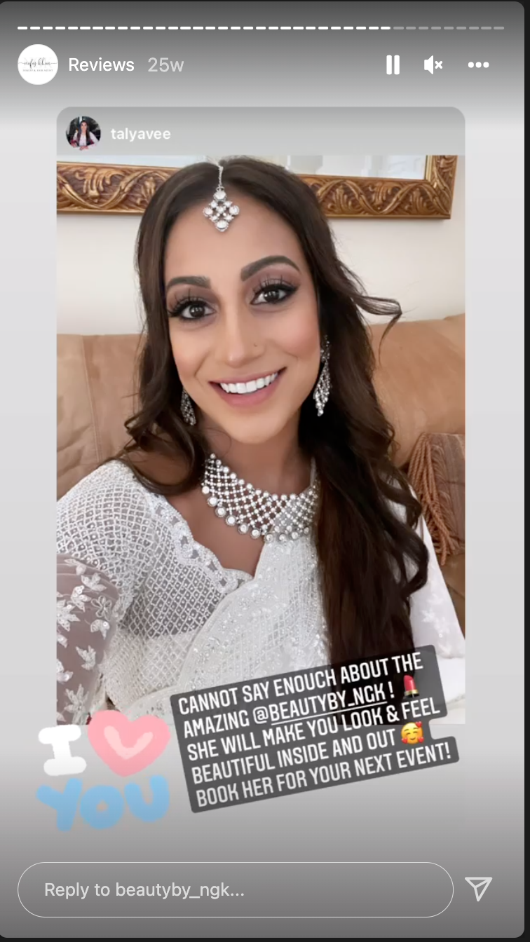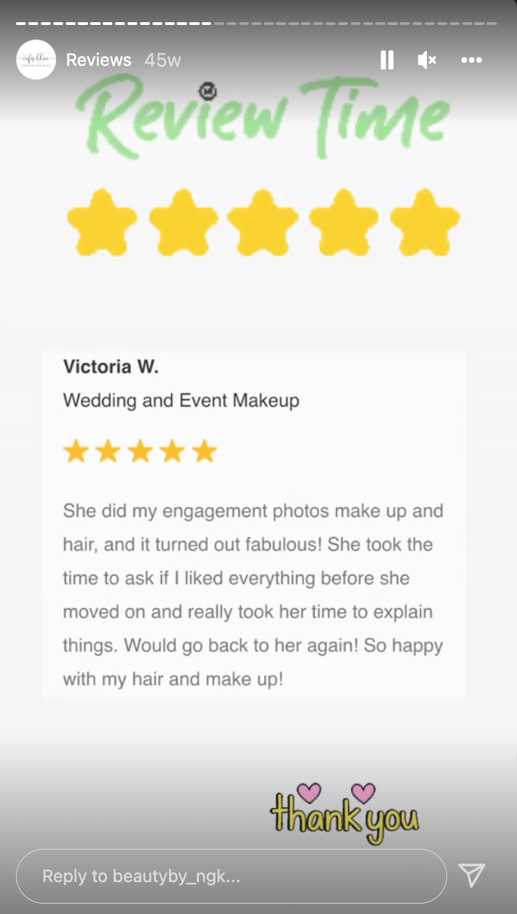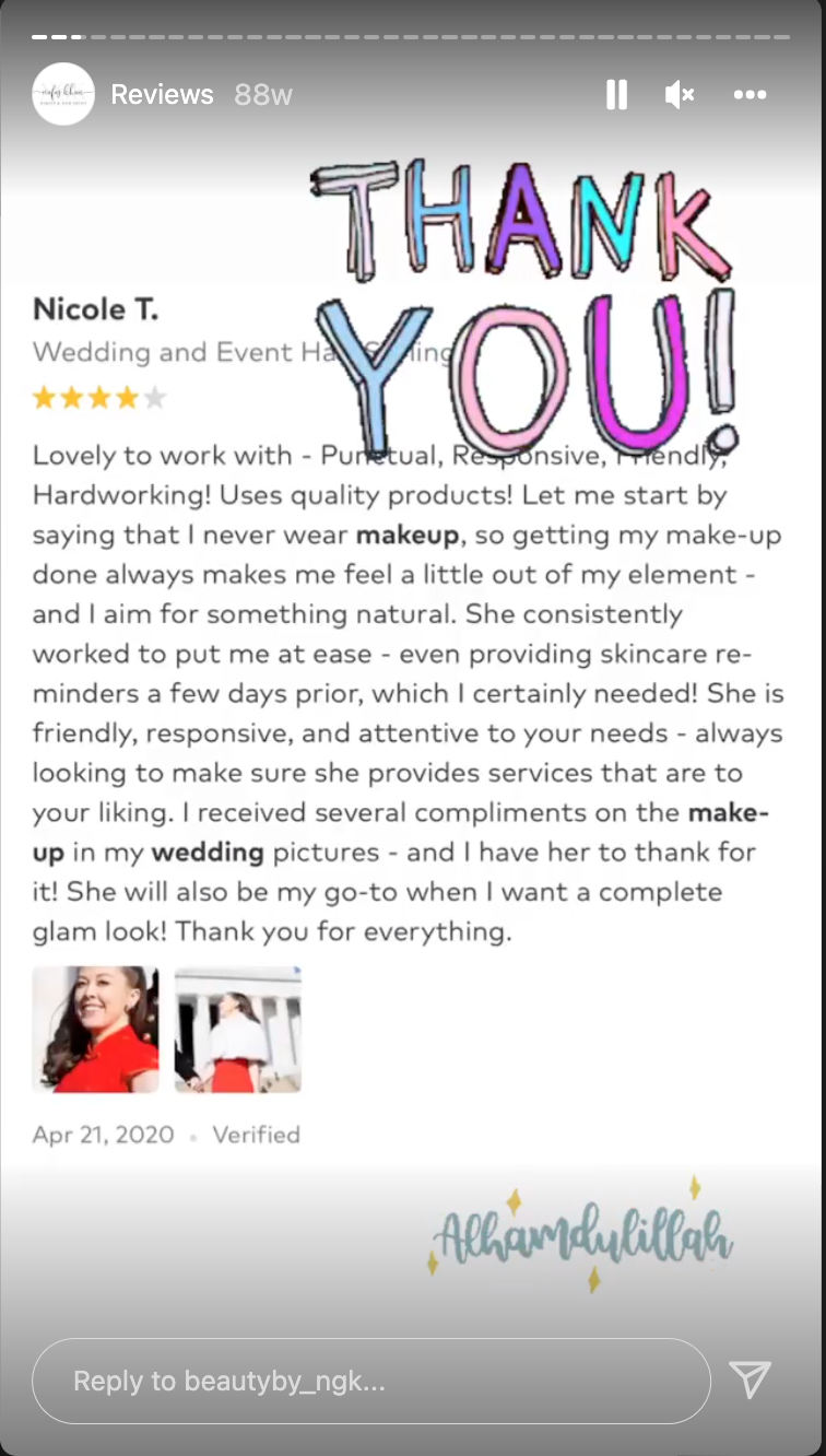 "I booked NGK for myself for hair and makeup. I’m so glad I did! She made me look so pretty and on top of that, she is one of the sweetest people I have ever met!"